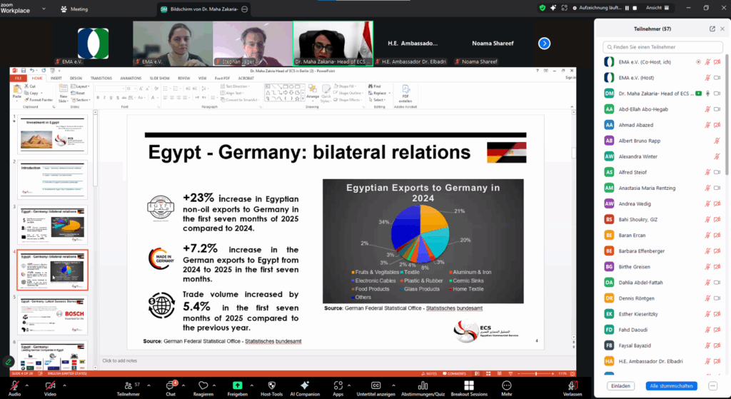 Der ägyptische Botschafter, S. E. Dr. Elbadri, hob die starke wirtschaftliche Leistung des Landes hervor, darunter ein BIP-Wachstum von 5 % im 4. Quartal 2024–2025 und eine stabile Inflation. Dr. Maha Zakaria präsentierte Zahlen, die zeigen, dass die deutschen Investitionen mittlerweile über 3 Milliarden US-Dollar betragen und rund 1.800 deutsche Unternehmen in Ägypten tätig sind, insbesondere im industriellen Sektor.